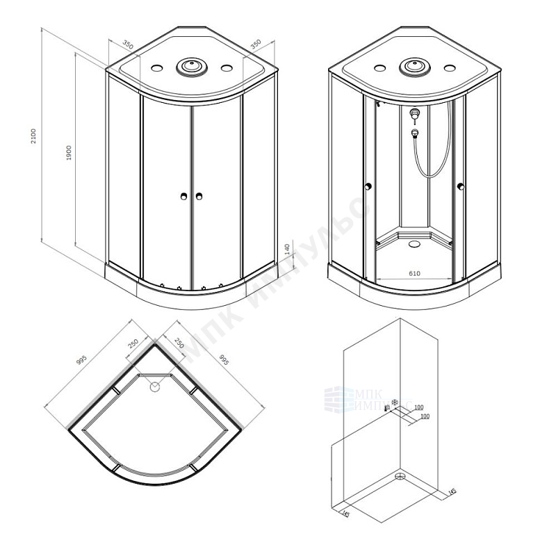 Кабина душевая X-Joy 1000х1000х2100 мм низкий поддон четверть круга прозрачное стекло алюминиевый профиль, хром матовый верхний душ AM.PM W94C-401-100MT