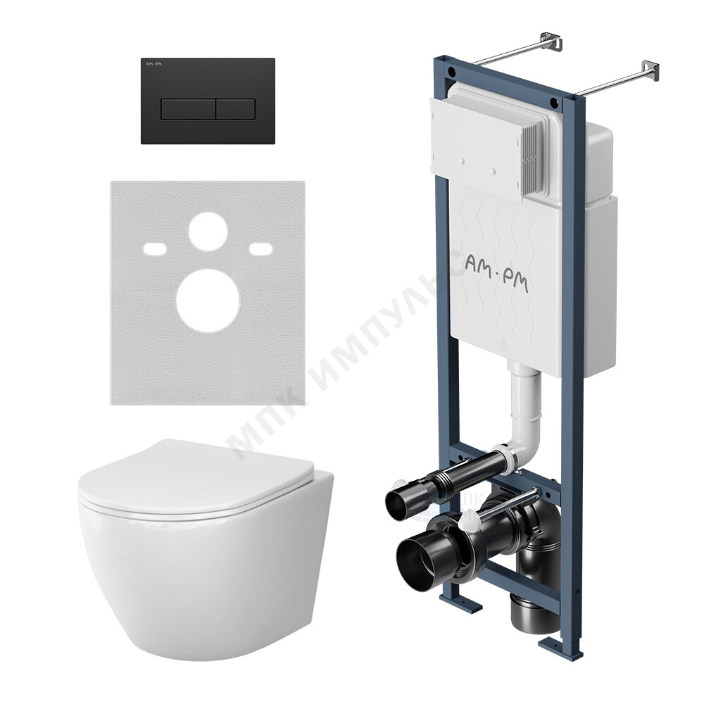 Комплект 4 в 1 инсталляция + кнопка смыва черная матовая + унитаз подвесной сиденье дюропласт микролифт белый Like AM.PM IS110338.801900