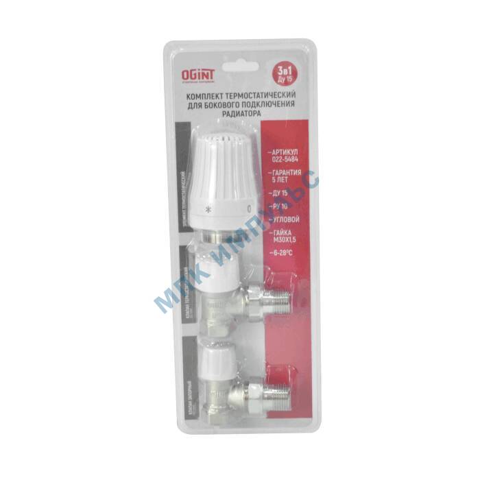 Комплект для бок/п радиатора термостатический 3в1 жид/нап для двухтр Ду 20 Ру10 угловой гайка М30х1,5 6-28oC без преднастройки штуцер без уплотнения Ogint