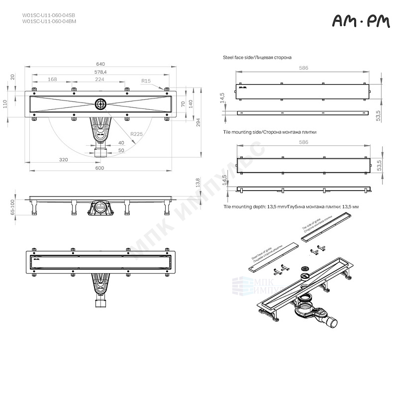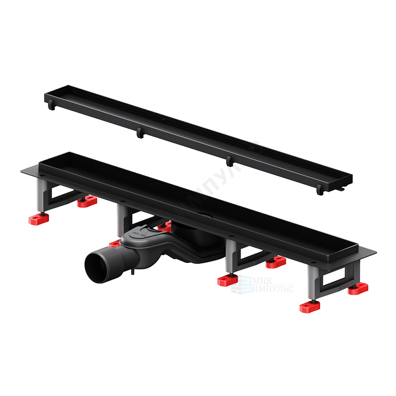 Лоток душевой с гидрозатвором+механический сухой затвор Дн 40/50 586х54мм решетка нержавеющая сталь, под плитку черная матовая горизонтальный выпуск MasterFlow AM.PM W01SC-U11-060-04BM