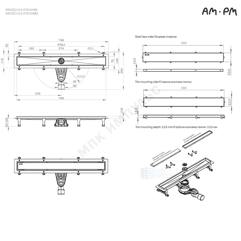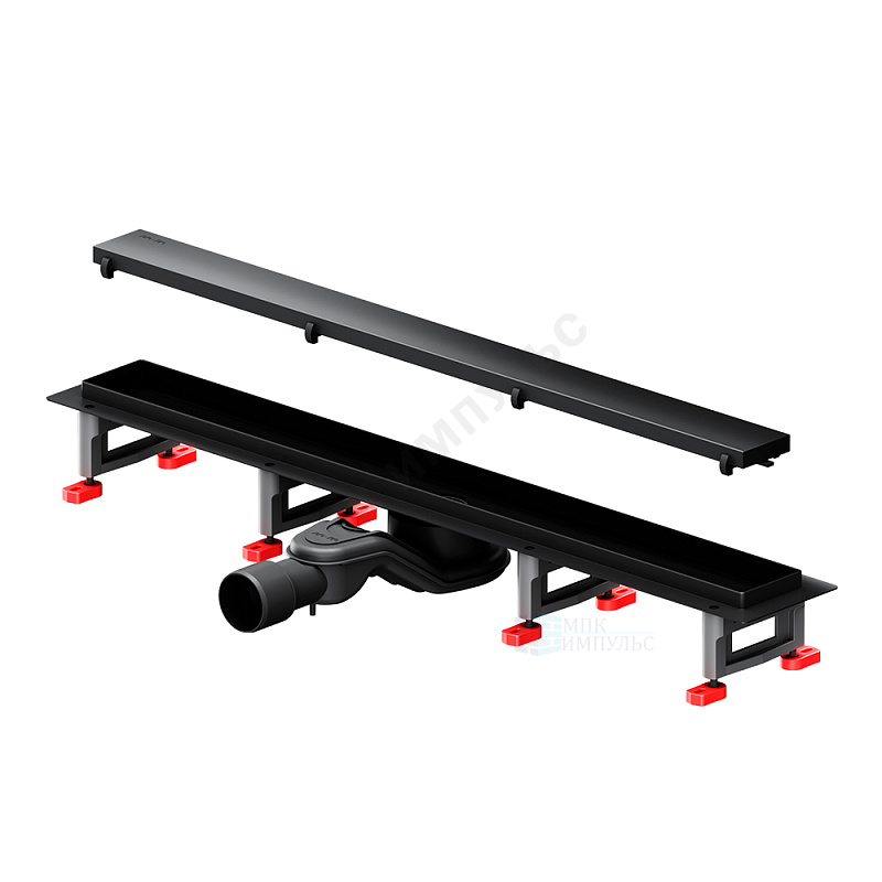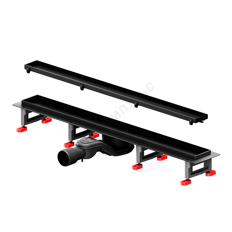 Лоток душевой с гидрозатвором+механический сухой затвор Дн 40/50 686х54мм решетка нержавеющая сталь, под плитку черная матовая горизонтальный выпуск MasterFlow AM.PM W01SC-U11-070-04BM