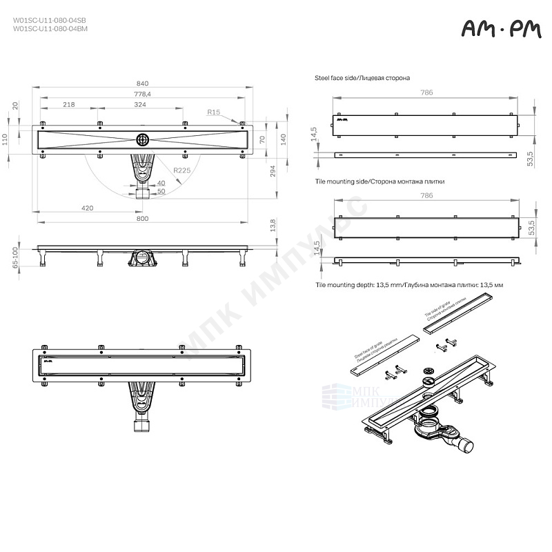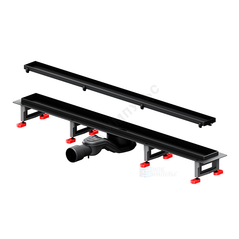 Лоток душевой с гидрозатвором+механический сухой затвор Дн 40/50 786х54мм решетка нержавеющая сталь, под плитку черная матовая горизонтальный выпуск MasterFlow AM.PM W01SC-U11-080-04BM