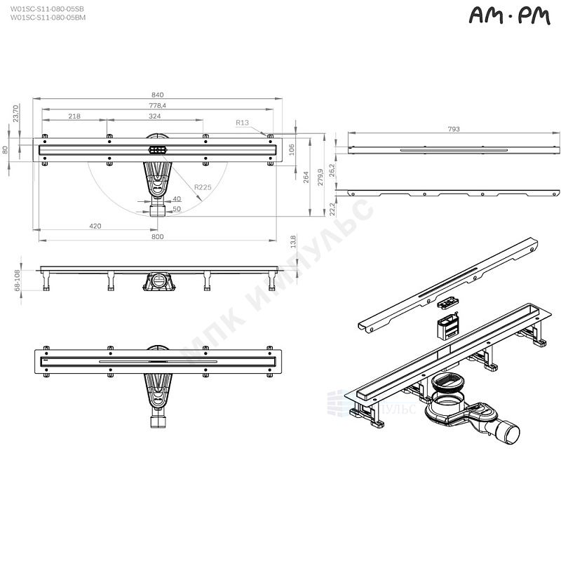 Лоток душевой с гидрозатвором+механический сухой затвор Дн 40/50 793х26мм решетка нержавеющая сталь, черная матовая горизонтальный выпуск MasterFlow AM.PM W01SC-S11-080-05BM