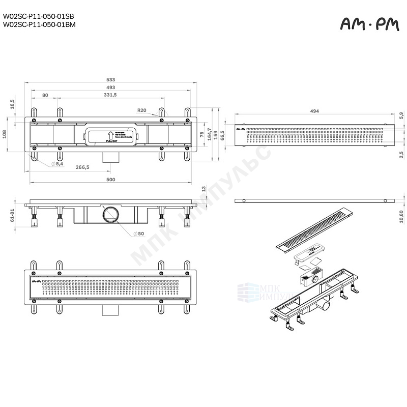 Лоток душевой с гидрозатвором+механический сухой затвор Дн 50 494х67мм решетка нержавеющая сталь матовая горизонтальный выпуск PrimeFlow AM.PM W02SC-P11-050-01SB