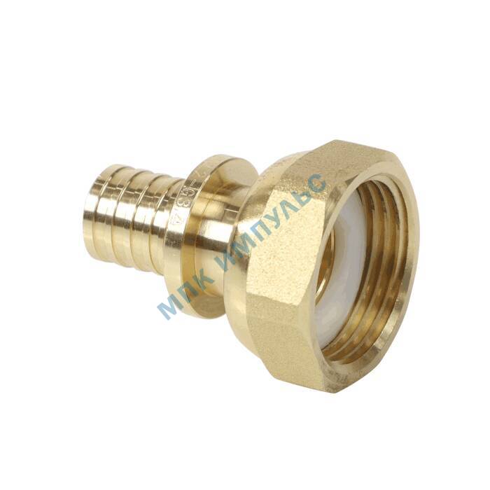 Соединитель для PE-X труб аксиальный латунь Дн 20х3/4″ под плоское уплотнение с накидной гайкой РОС