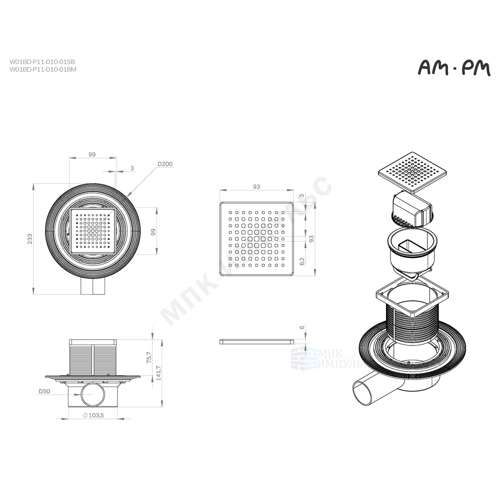 Трап нерегулируемый с гидрозатвором+механический сухой затвор Дн 50 с нержавеющей решёткой 93х93мм горизонтальный выпуск MasterFlow AM.PM W01BD-P11-010-01BM