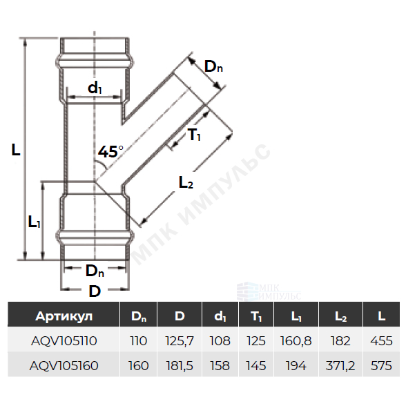 Тройник НПВХ SDR26 Дн 110х45гр Ру10 серый напорный раструбный под соединение с уплотнительным кольцом в/к Aquaviva AQV105110