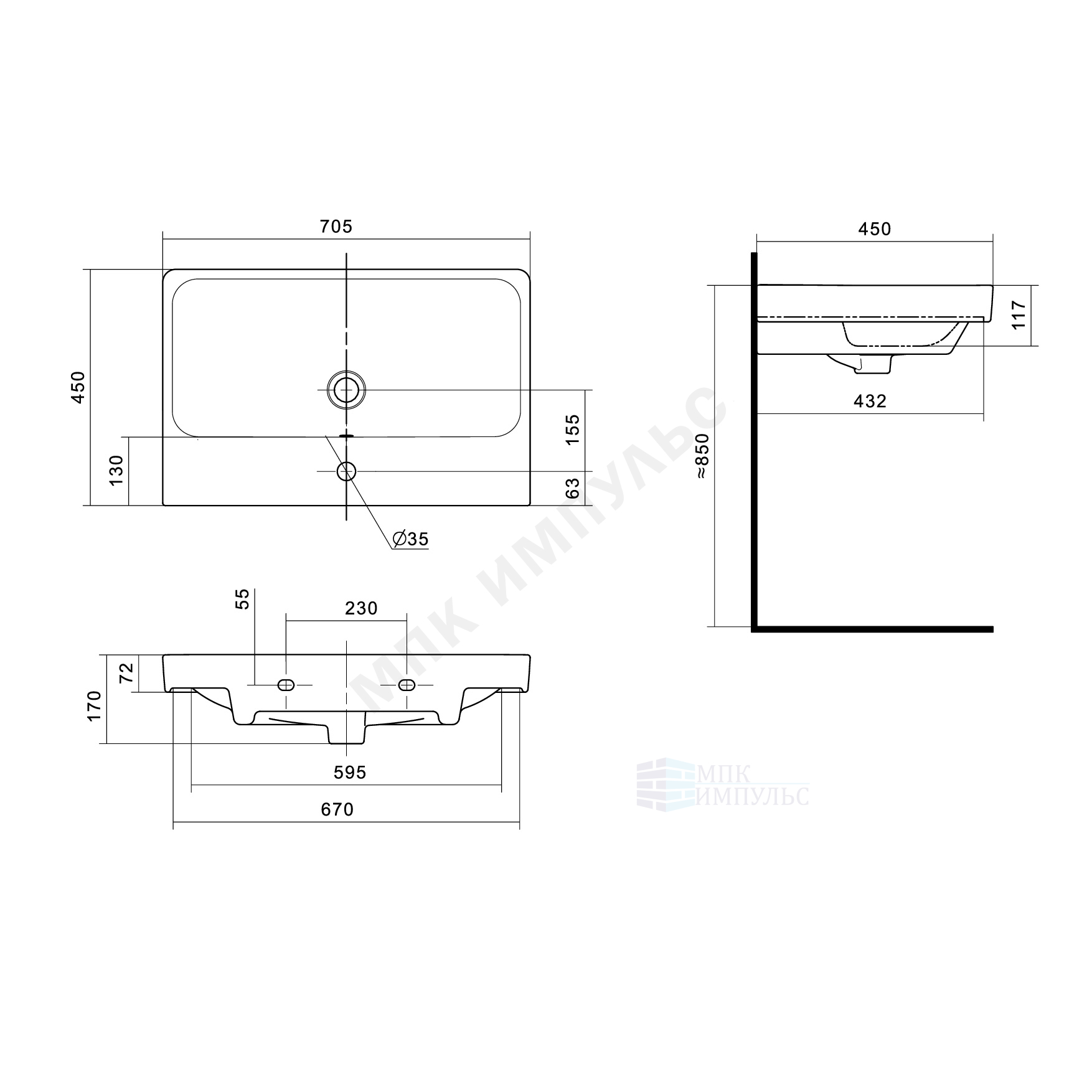Умывальник мебельный Адриана 70 1 отверстие под смеситель по центру Santek 1.WH50.1.628