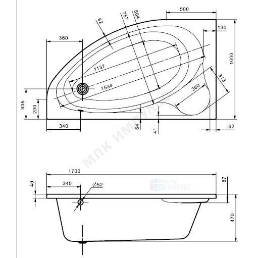 Ванна акриловая Эдера L 170х100см без ножек левосторонняя Santek 1.WH50.1.662