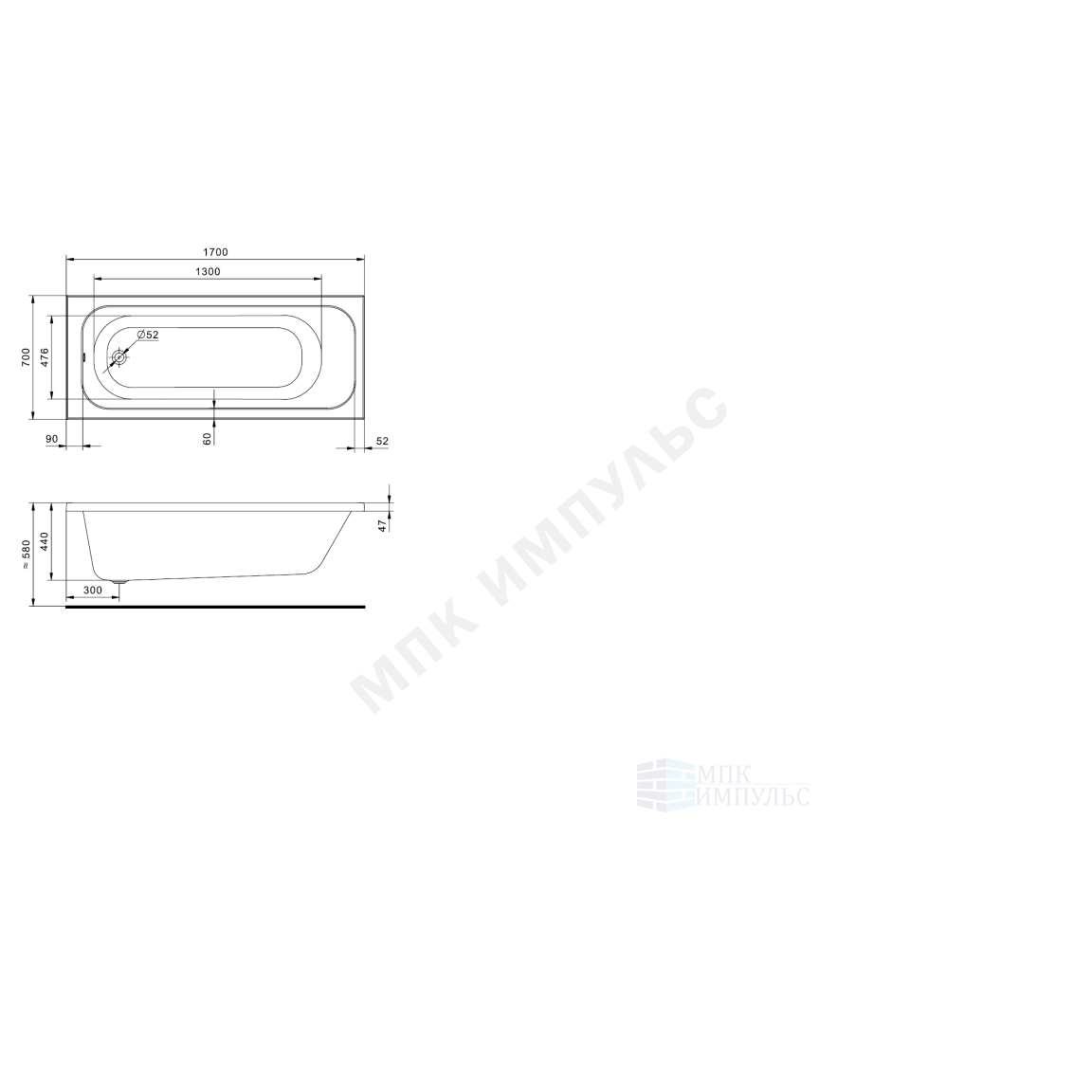 Ванна акриловая Ламма 170х70см без ножек Santek 1.WH50.1.747